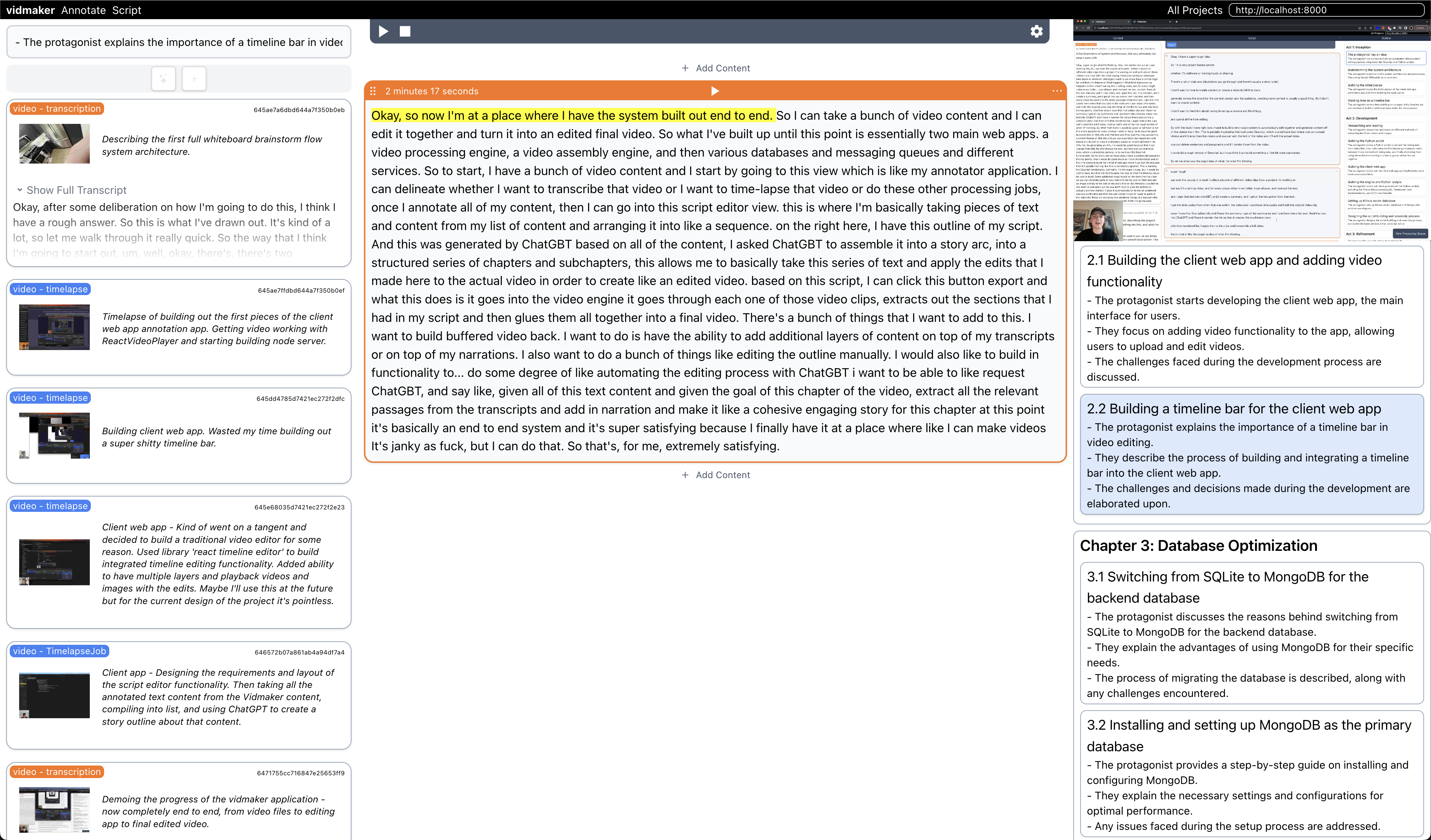 On the left you could semantically search your media, in the middle you could add media and edit the transcripts, and on the right you could switch between "chapters" of the full video.