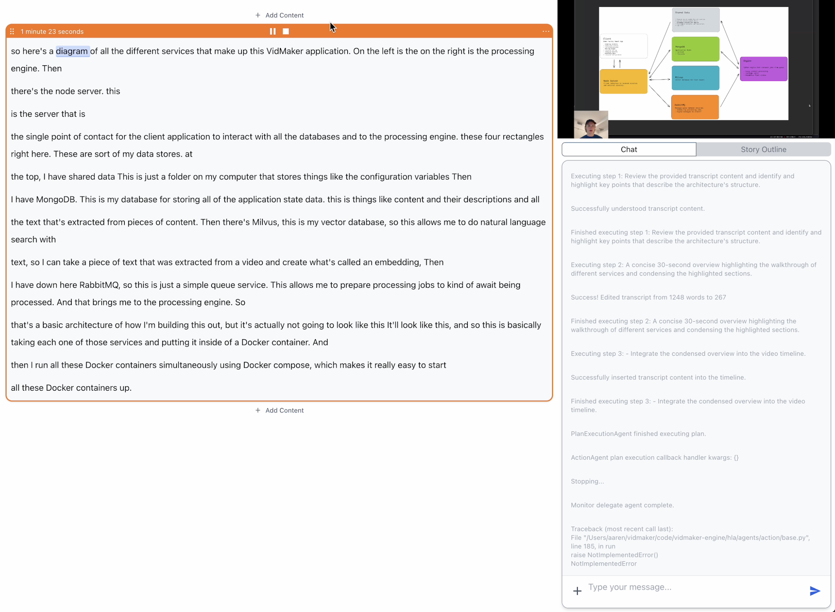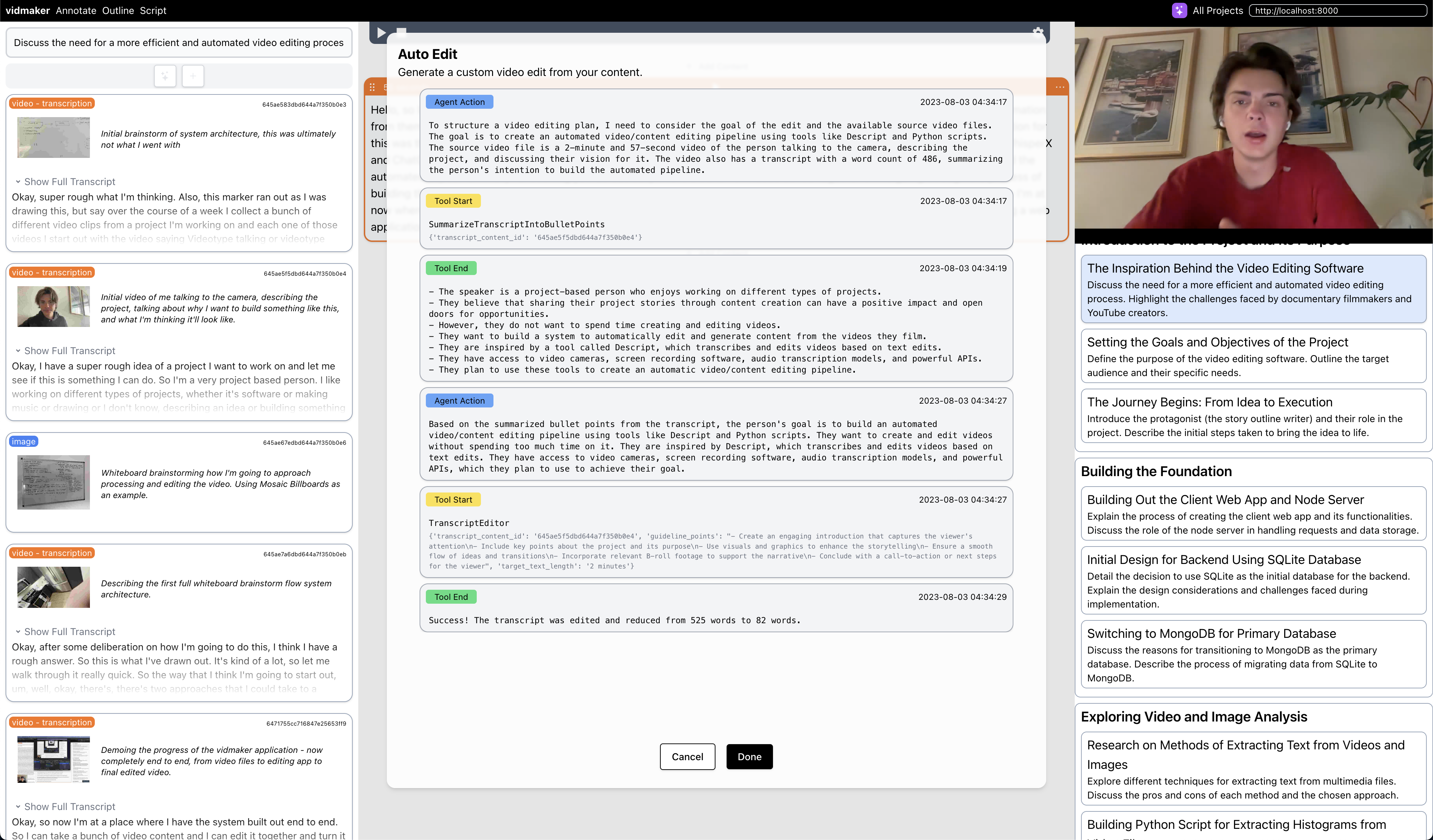Then I spent lots of time working with the ReAct agent framework (this is when AI agents we're a fairly new thing) to attempt editing videos automatically within the editor. This was fraught with issues and worked ~30% of the time, but dear lord was that satisfying when it did.