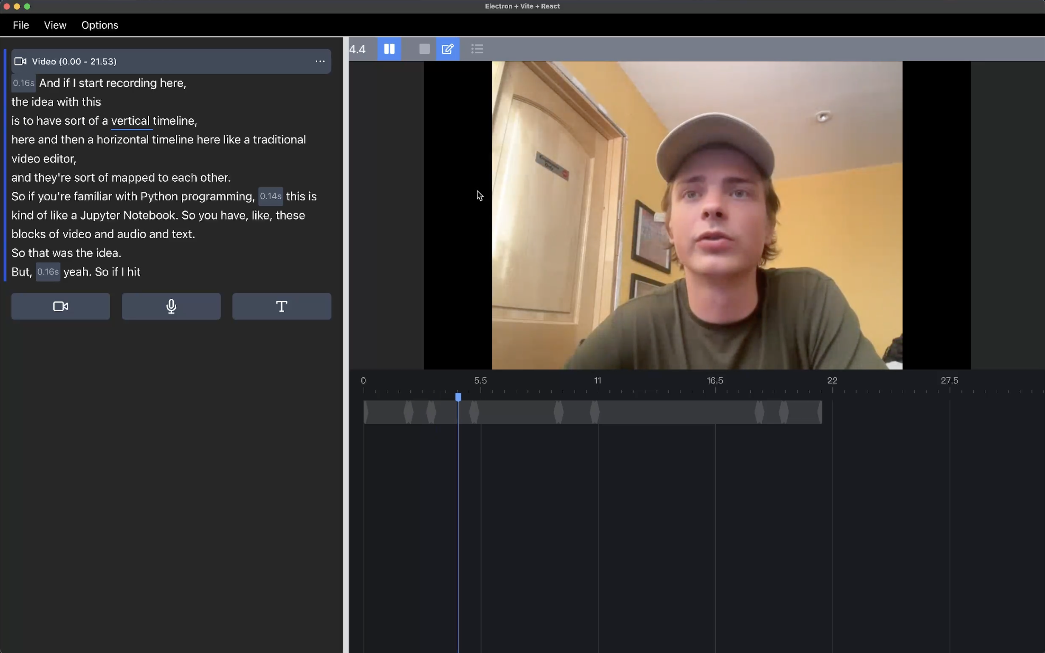 As you can see my goal was to create a video of me building this software using the software itself, which didn't pan out. The hardest aspect was real time playback and quickly splicing and playing sub-clips.