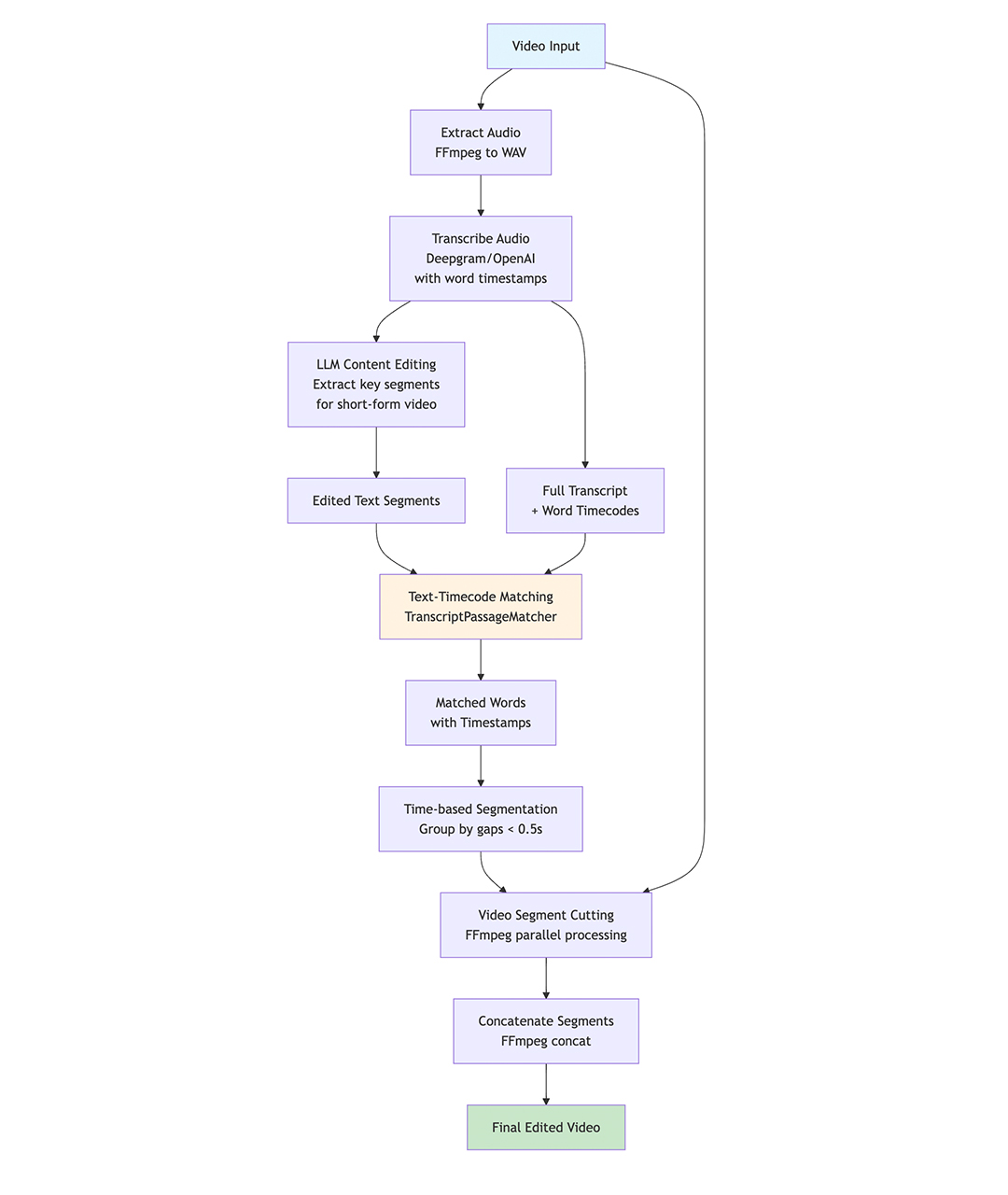 This is a simple tool to automatically edit down a video transcript using LLMs, then apply those text edits to the original video file. For me this is useful to create short summary clips from long ranty brainstorm videos.